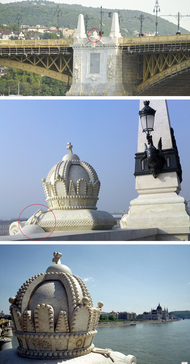 Most nézd meg ezt a hidat! Például erre, a felújítás leple alatt, odaraktuk nekik a képükbe Jákimot és Boázt, közéjük pedig egy kőszobrot, ami a leláncolt szentkoronájukat ábrázolja. Ezek meg ott ácsorognak, nézegetik, fényképezik a két oszlop között a koronát, és egyik nem kérdezi meg, hogy ugyan miért van leláncolva... No de várjál....